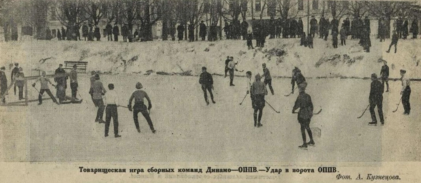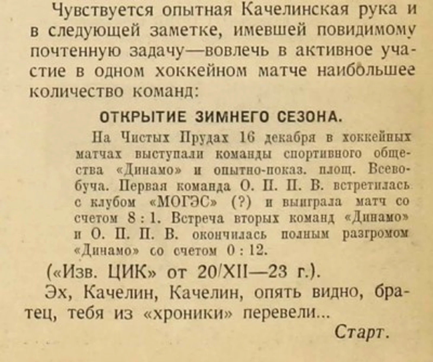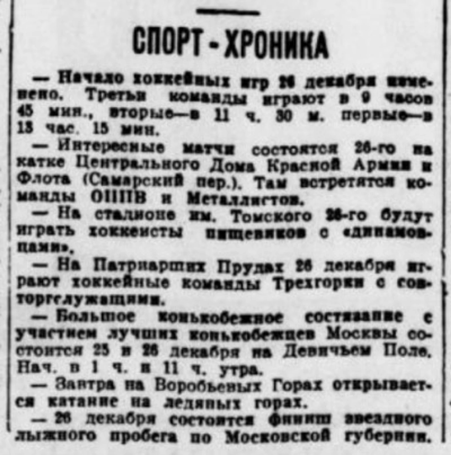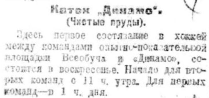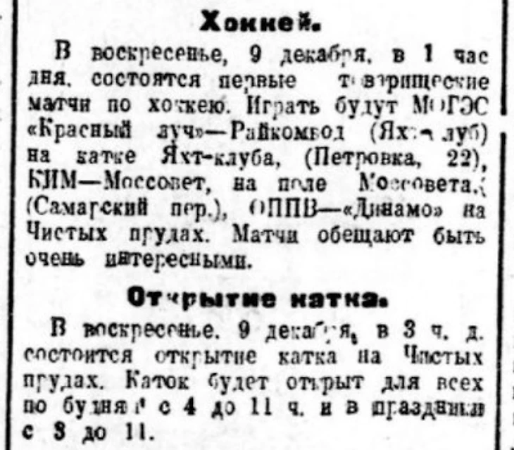 «В воскресенье, 9 декабря, в 1 час дня, состоятся первые товарищеские матчи по хоккею. Играть будут МОГЭС «Красный луч» - Райкомвод («Яхт-клуб») на катке «Яхт-клуба» (Петровка, 22); КиМ - «Моссовет» на поле «Моссовета» (Самарский пер.); ОППВ - «Динамо» на Чистых прудах» (газета «Вечерняя Москва» № 1 от 6 декабря 1923 года)
