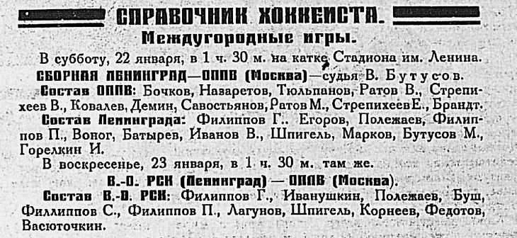 22 января 1927 года. Ленинград. Стадион им. В.И. Ленина. Междугородняя игра. Ленинград (сборная) - ОППВ (Москва). 23 января 1927 года. Ленинград. Стадион им. В.И. Ленина. Междугородняя игра. Василеостровский РСК (Ленинград) - ОППВ (Москва). Предварительные составы команд (еженедельный журнал «Спартак» № 4 от 23 января 1927 года орган Ленинградского губернского совета физической культуры)