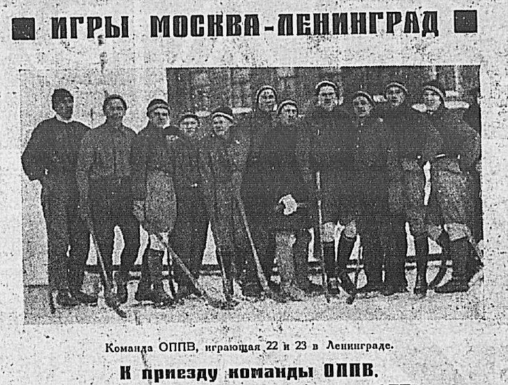 Январь 1927 года. Москва. Хоккейная команда ОППВ (еженедельный журнал «Спартак» № 4 от 23 января 1927 года орган Ленинградского губернского совета физической культуры)