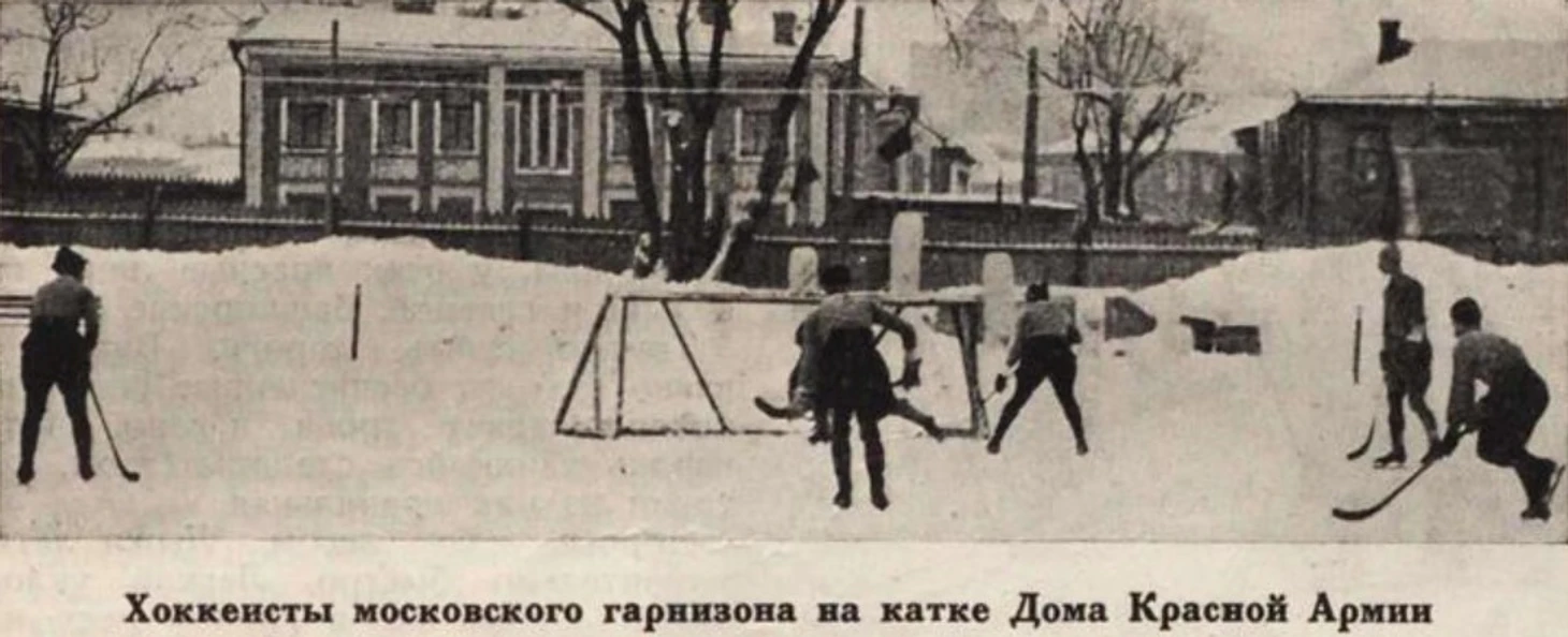 23 февраля 1928 года. Москва. Каток ЦДКА (Самарский пер.) «Сегодня начинаются большие спортивные состязания между воинскими командами. На катке Центрального дома Красной Армии и Флота (Самарский пер.) в 10 часов утра открылся розыгрыш первенства Московского гарнизона по конькам. В 1 час дня начался хоккейный матч между сборными командами Московского и Ленинградского гарнизонов. Завтра с утра продолжение конькобежных состязаний и в 2 часа дня хоккейный матч сборной команды Ленинградского гарнизона с хоккеистами ОППВ» (газета «Вечерняя Москва» № 46 от 23 февраля 1927 года). «Хоккеисты московского гарнизона на катке Дома Красной Армии» (журнал «Физкультура и спорт» № 9 от 1 марта 1928 года)