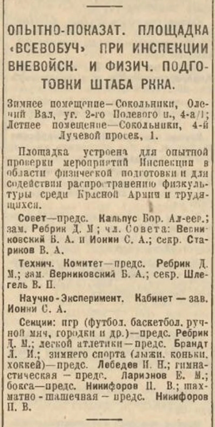 ** - Всевобуч (Всеобщее военное обучение) - система обязательной военной подготовки граждан созданная в марте 1918 года. В 1920 году во Всевобуче для руководства физкультурой и спортом во всей стране появляется Высший совет физической культуры (ВСФК), который организовывал военно-спортивные клубы, кружки и ячейки, строил физкультурные площадки, вел методологическую работу, издавал журнал «Всевобуч и спорт», проводил соревнования всех уровней по различным видам спорта