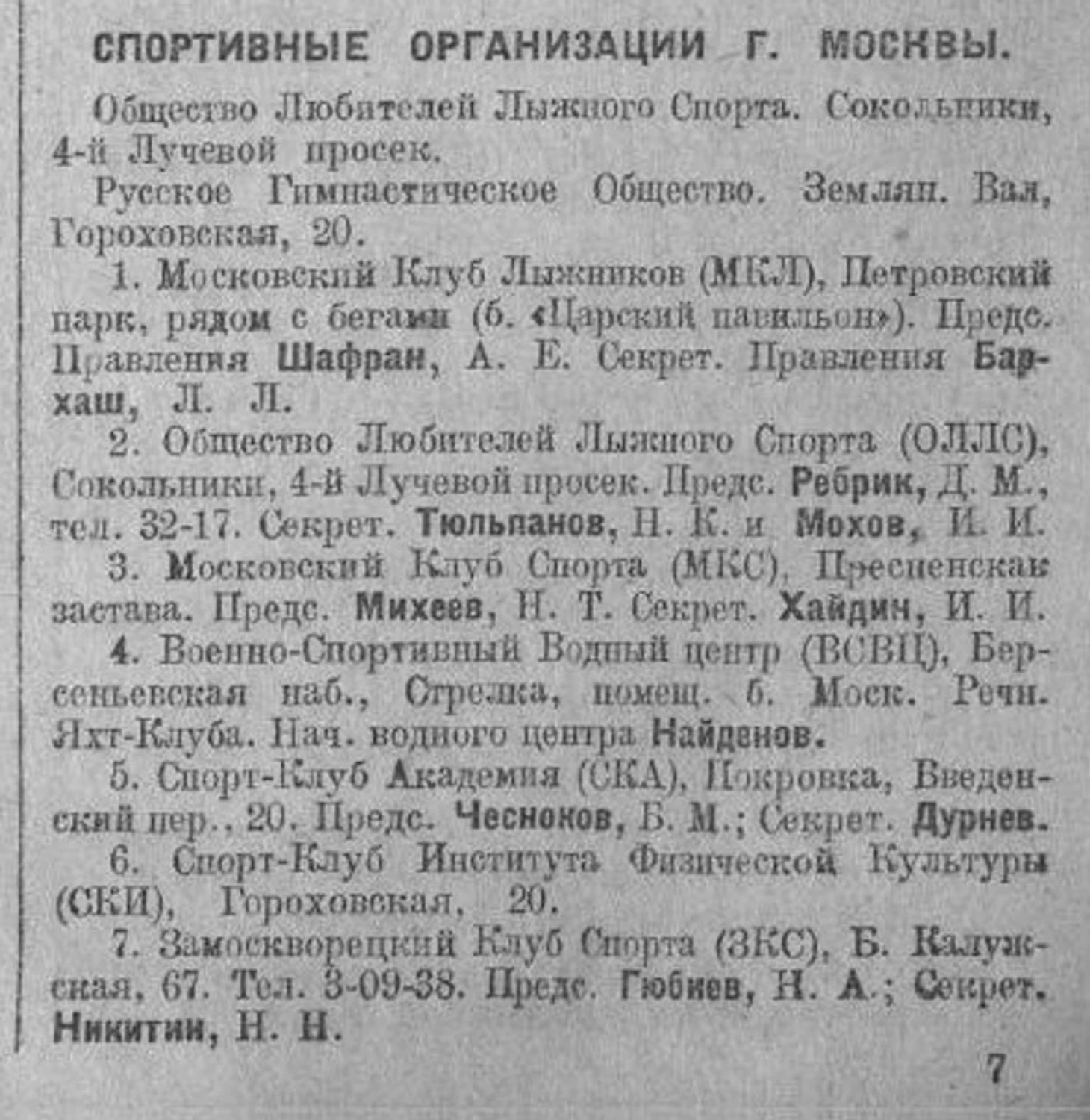 1923 год. ОЛЛС и другие спортивные организации города в адресном справочнике «Вся Москва. 1923 год»