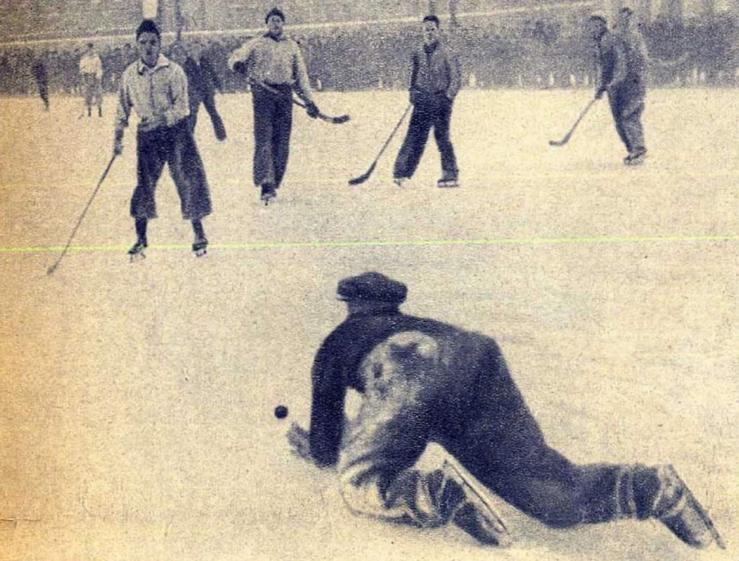 18 января 1937 года. Москва. Каток парка ЦДКА (Площадь Коммуны). Первенство Москвы. ЦДКА - «Спартак» - ЦДКА - 1:3 (1:1). «Вратарь ЦДКА [Николай Исаев] берет мяч» (фото И. Фетисова из газеты «Вечерняя Москва» № 15 от 19 января 1937 года)