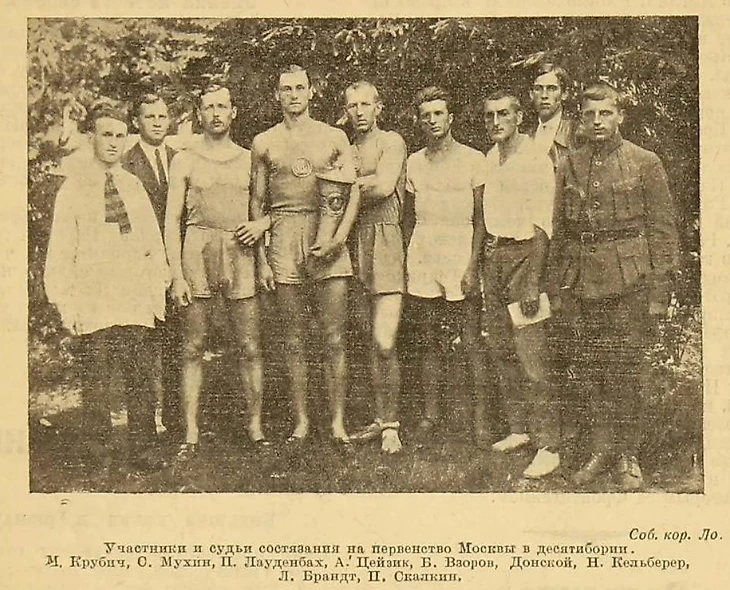 Июль 1922 года. Москва. Летняя площадка ОЛЛС. Первенство Москвы по легкоатлетическому десятиборью. Один из основателей хоккейного ЦСКА - Марк Крубич (первый слева) среди участников и судей (журнал «Известия спорта» № 3 от 5 августа 1922 года)