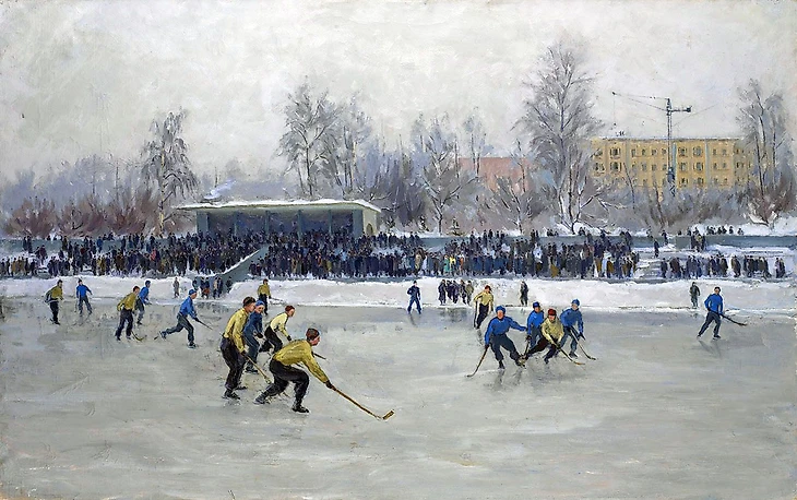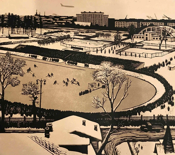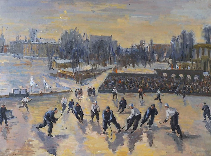 1947 год. Владимир Васильев «Хоккей» (картина с изображением малого стадиона «Динамо» созданная к выставке «Москва в произведениях художников» в честь к 800-летия Москвы)