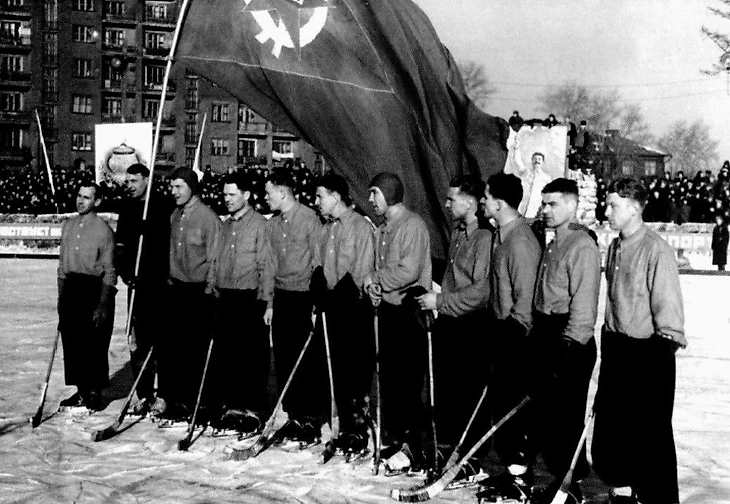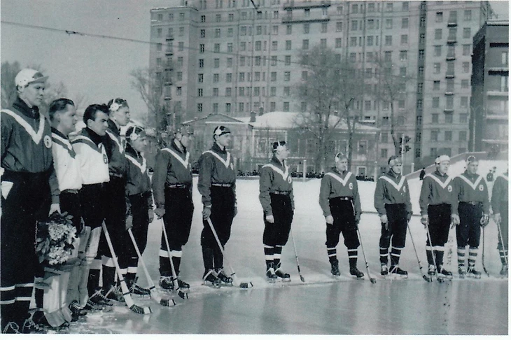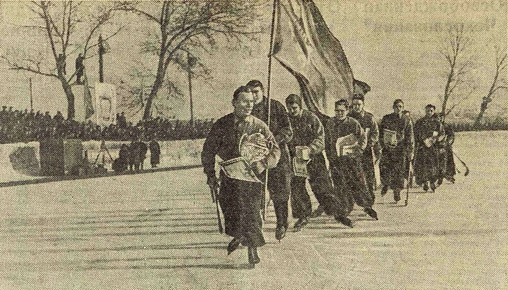 24 февраля 1946 года. Москва. Малый стадион «Динамо». 15 000 зрителей. Кубок СССР. Финал. ЦДКА - «Крыльев Советов» - 2:0 (1:0). Круг почета победителей. «Вчера на малом стадионе «Динамо» состоялась финальная встреча на Кубок СССР по хоккею между командами ЦДКА и «Крыльев Советов». На снимке победительница встречи команда ЦДКА покидает поле с Кубком СССР по хоккею» (фото Г. Яблоновского из газеты «Вечерняя Москва» № 47 от 25 февраля 1946 года)