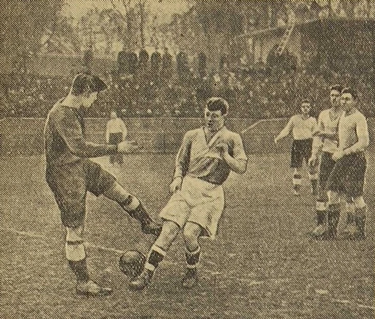 17 февраля 1946 года. Москва. Малый стадион «Динамо». 10 000 зрителей. Кубок СССР. Полуфинал. ЦДКА - «Динамо» (Москва) - 3:1 (0:1). «Один из моментов игры» (фото Г. Яблоновского из газеты «Вечерняя Москва» № 41 от 18 февраля 1946 года)