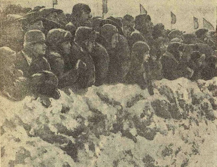 17 февраля 1946 года. Москва. Малый стадион «Динамо». 10 000 зрителей. Кубок СССР. Полуфинал. ЦДКА - «Динамо» (Москва) - 3:1 (0:1). «Зрители за снежным забором» (фото Г. Яблоновского из газеты «Вечерняя Москва» № 41 от 18 февраля 1946 года)