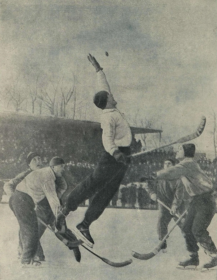 17 декабря 1944 года. Москва. Малый стадион «Динамо». Приз открытия сезона. «Эстафета московских хоккеистов. Момент передачи эстафеты игроками команды ЦДКА» (газета «Красный спорт» № 51 от 19 декабря 1944 года)