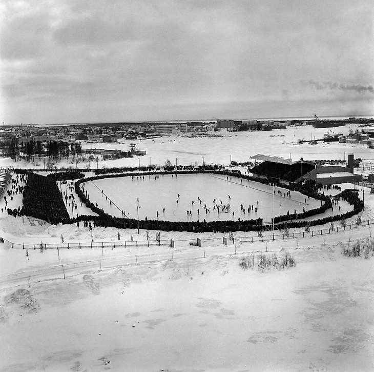 21 февраля 1959 года. Оулу. Остров Раатинсаари. Стадион «Раати». 14 341 зритель. Товарищеская игра. Финляндия - СССР - 2:5 (1:3). Общий вид стадиона во время игры (museovirasto.finna.fi)