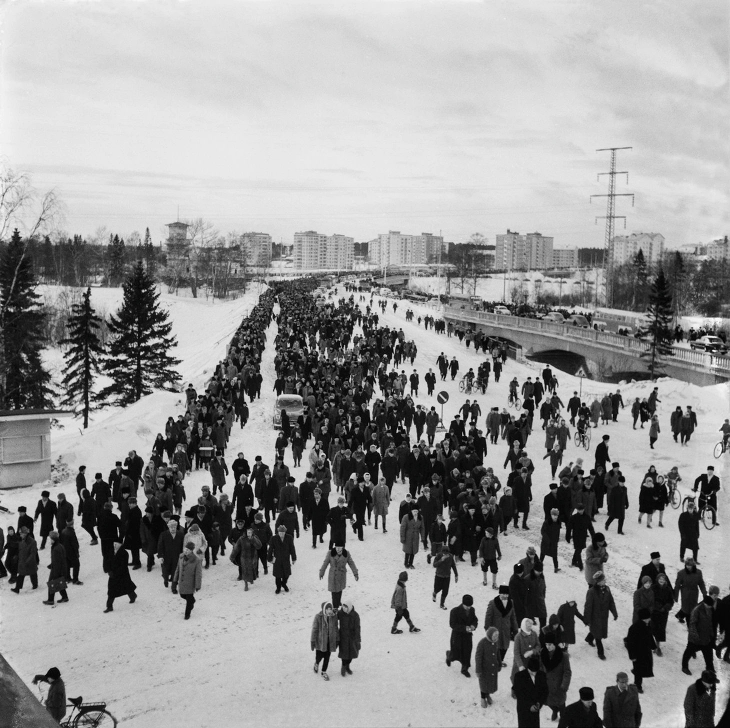 21 февраля 1959 года. Оулу. Стадион «Раати». 14 341 зритель. Товарищеская игра. Финляндия - СССР - 2:5 (1:3). Зрители, покидающие стадион (museovirasto.finna.fi)