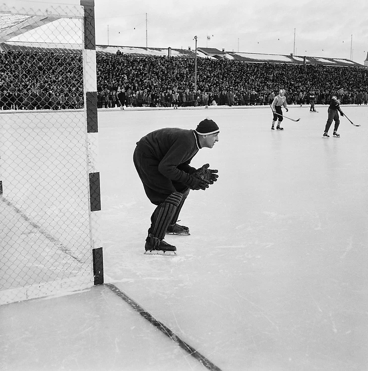 21 февраля 1959 года. Оулу. Стадион «Раати». 14 341 зритель. Товарищеская игра. Финляндия - СССР - 2:5 (1:3). Голкипер сборной Советского Союза Анатолий Мельников (museovirasto.finna.fi)
