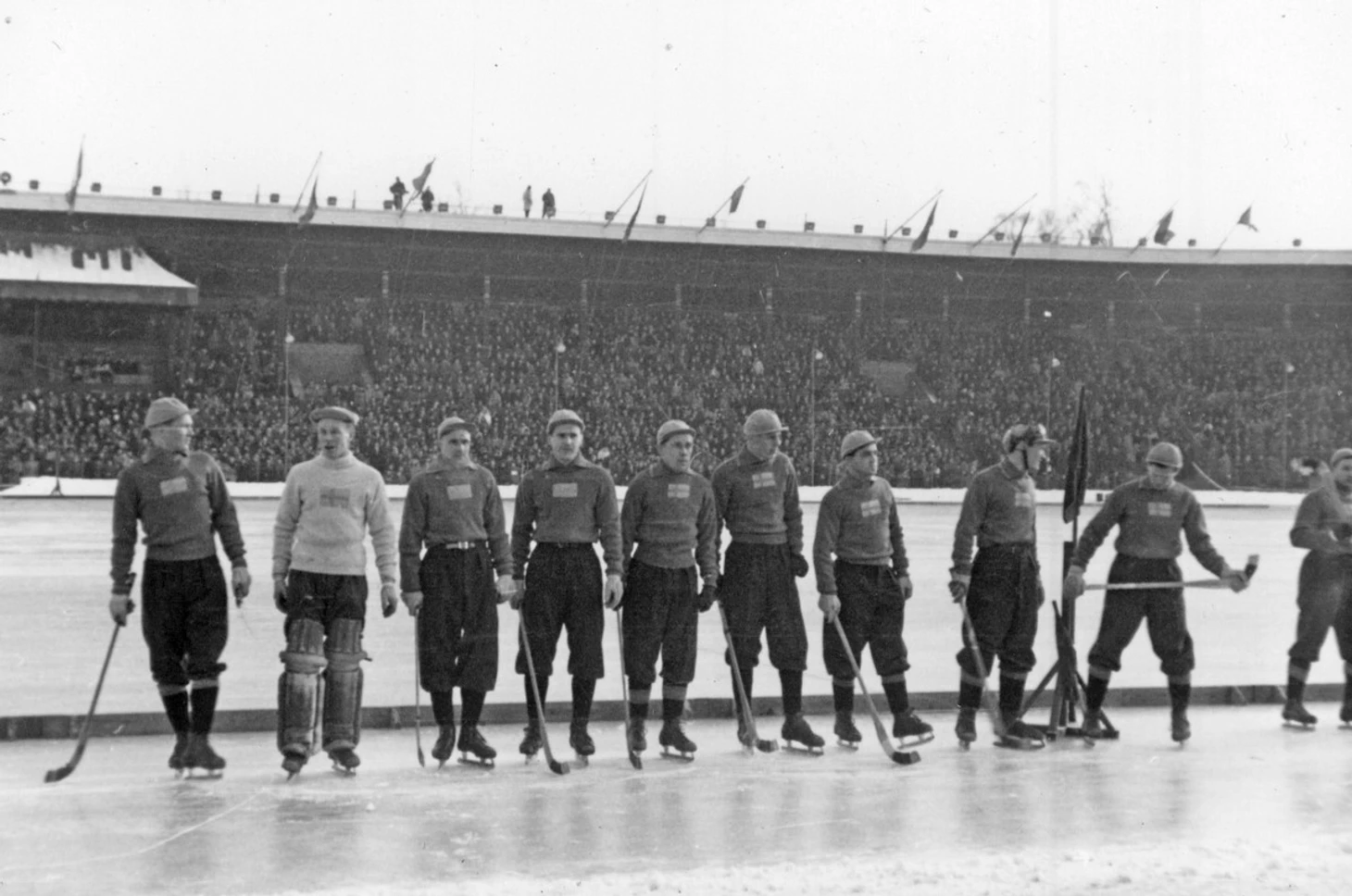 13 февраля 1955 года. Стокгольм. Олимпийский стадион. 20 000 зрителей. - 8°C. Турне сборной Советского Союза по Северной Европе. Швеция - СССР - 2:2 (2:1). Шведы перед матчем. Они традиционно играли в желтых свитерах, на которые был нашит синий флаг с желтым крестом, но фотографии того времени это плохо передают. Шведская «Википедия» (sv.wikipedia.org/wiki/Sveriges_flagga) по этому поводу пишет следующее: «Шведский флаг на фотографиях 19-го и начала 20-го веков кажется белым с темным крестом из-за того, что фотографические стекла и пленки тогда имели ортохроматическую эмульсию, нечувствительную к красному свету и очень чувствительную к синему. На негативе участки синего цвета оказывались переэкспонированными, а участки желтого цвета <...> - недоэкспонированными, поэтому желтый цвет на флаге становился темнее, чем обычно, в то время как синий смотрится очень ярким» (фото digitaltmuseum.se)