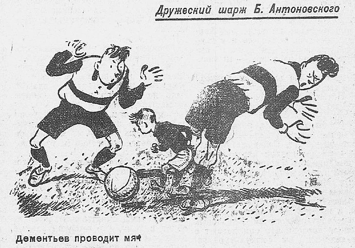 24 октября 1932 года. Ленинград. Стадион имени В.И. Ленина. Ленинград - Германия - 2:2. «Дементьев проводит мяч» (рост «Пеки» - 163 см). Рисунок Б. Антоновского из газеты «Спартак» органа Ленинградского областного совета физкультуры № 17 от 30 октября 1932 года