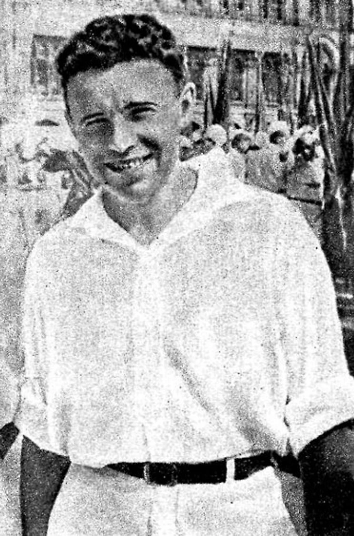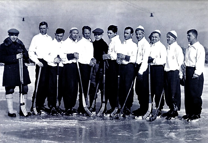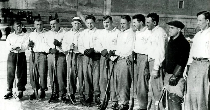 26 февраля 1928 года. Осло. Стадион «Бислет». Международная зимняя Спартакиада Красного спортивного интернационала. Ленинградский динамовец Павел Батырев - капитан сборной Советского Союза (седьмой слева), выигравшей турнир (фото из норвежского архива Arbeiderbevegelsens arkiv og bibliotek впервые опубликованное в газете «Норгес коммунистблад» от 27 февраля 1928 года)