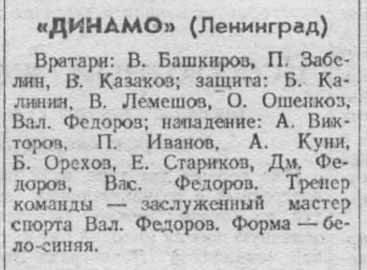 Состав: Симонов; Егоров и Кузьмин, Ошенков, Смольников и Валентин Федоров; Шелагин, Петр Дементьев, Бутусов, Виктор Федоров и Марков