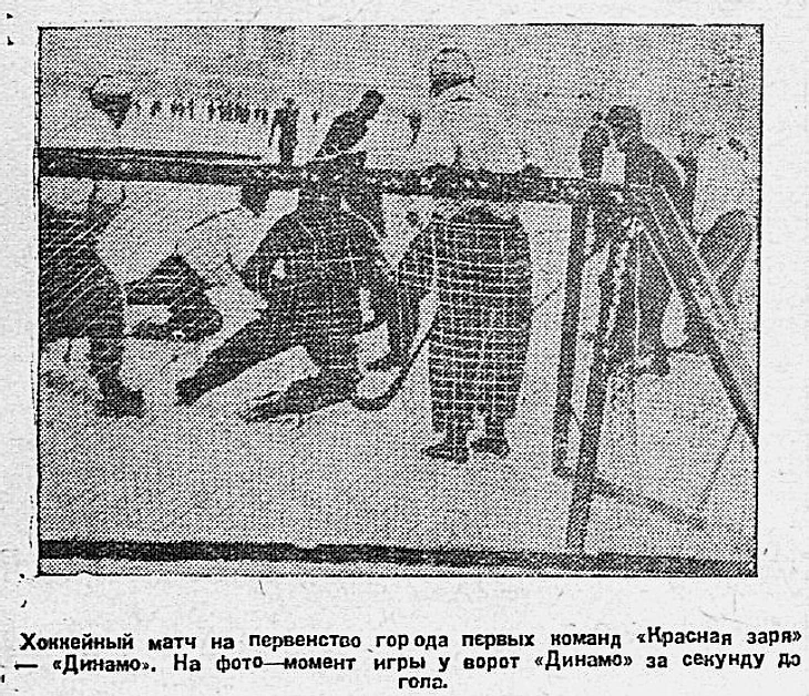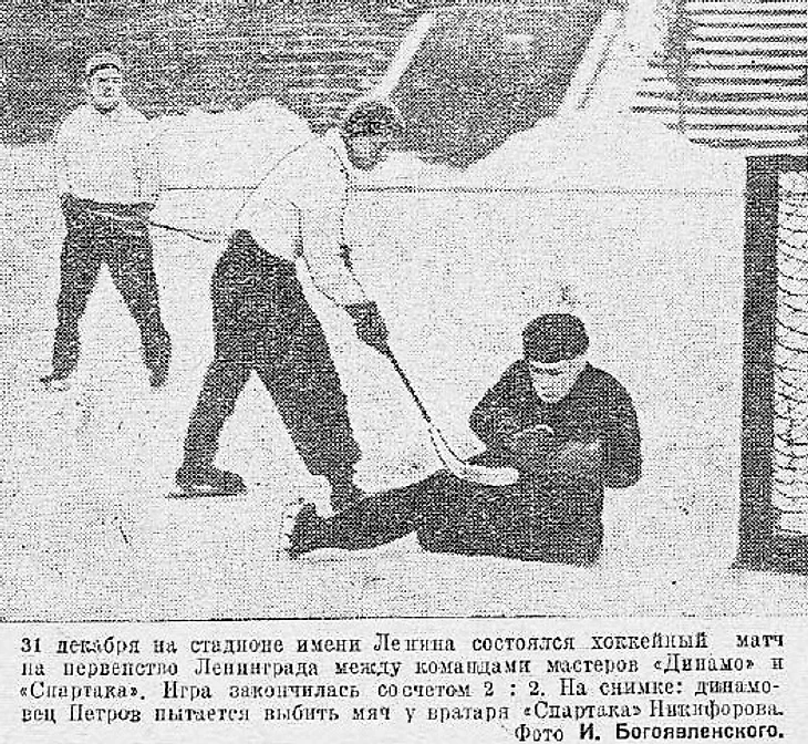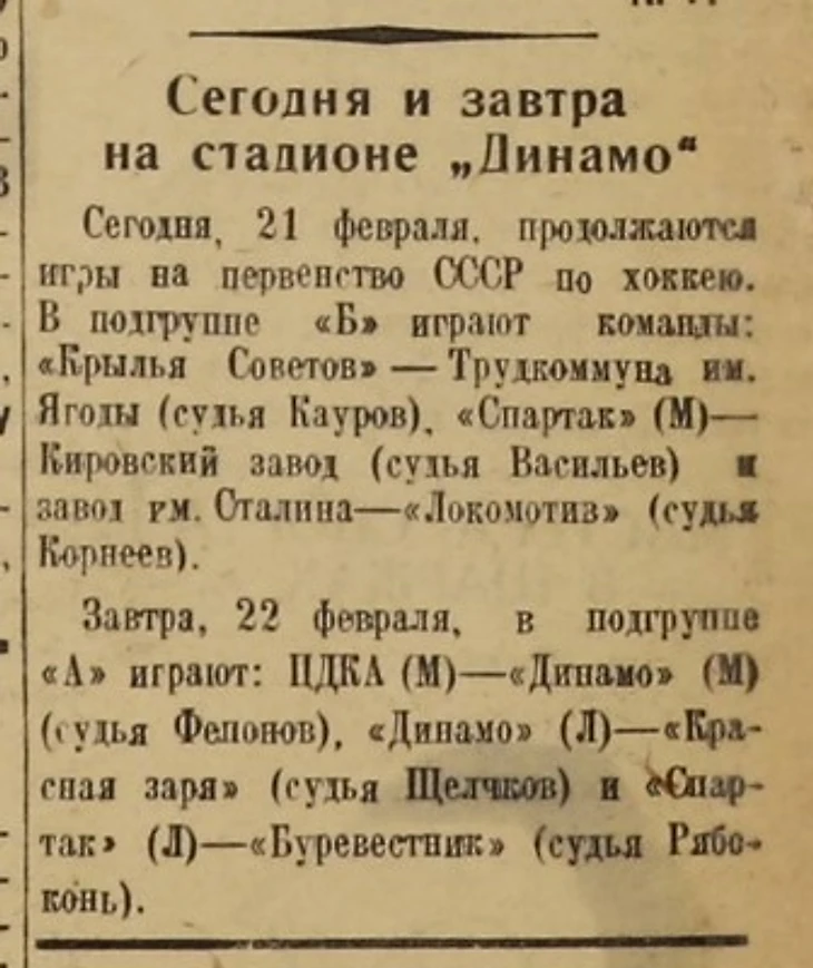 «Вчера на стадионе «Динамо» был разыгран второй полуфинальный матч мужских команд, участвующих в розыгрыше Кубка СССР по хоккею. Играли «Крылья Советов» (Москва) и ленинградское «Динамо». Встреча прошла в упорной борьбе. Первая половина игры заканчивается со счетом 0:0. Второй тайм дал результат 1:1. Командам дано добавочное время. Московские хоккеисты увеличивают счет до 2:1. За четверть минуты до конца игры ленинградцы отвечают голом в ворота москвичей. Однако судья не фиксирует гол, считаю, что мяч был забит неправильно. Ленинградское «Динамо» опротестовало матч. Протест признан обоснованным. Полуфинальная встреча будет завтра переиграна» (газета «Вечерняя Москва» № 42 от 19 февраля 1946 года).