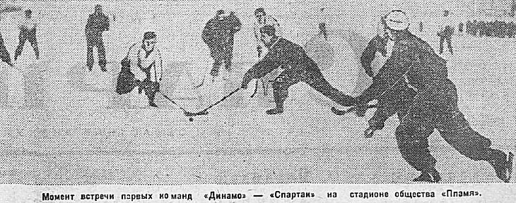 «Наибольший интерес в первом туре вызвала встреча московского «Спартака» и динамовцев Ленинграда. Любители хоккея заполнили трибуны стадиона. Литовский судья В. Вашкятис вызывает на поле участников матча. У всех игроков большие яркие номера на рубашках. Вратари в своих больших «щитках» и нагрудниках, защищенные налокотниками и специальными перчатками от сильных ударов резиновой шайбы, занимают места у небольших сетчатых ворот. Резкая трель свистка извещает о начале матча. Всеобщее восхищение вызывает игра ленинградского вратаря П. Забелина и московских форвардов, лидируемых И. Новиковым. Вскоре на щите «Спартака» появляется единица. Это Зикмунд забил гол. Затем Новиков удачно ловит шайбу на клюшку и кидает ее в ворота. 2:0. Начинается второй тайм. «Спартак», играя быстрей и тактически правильней, увеличивает счет до 3:0. В третьем тайме Забелин трижды вынужден вынуть шайбу из сетки. Лишь в конце игры ленинградец Д. Федоров забивает единственный гол в ворота москвичей. Со счетом 6:1 в пользу «Спартака» команды, приветствуемые зрителями, покидают ледяное поле» (газета «Труд» от 24 декабря 1946 года).