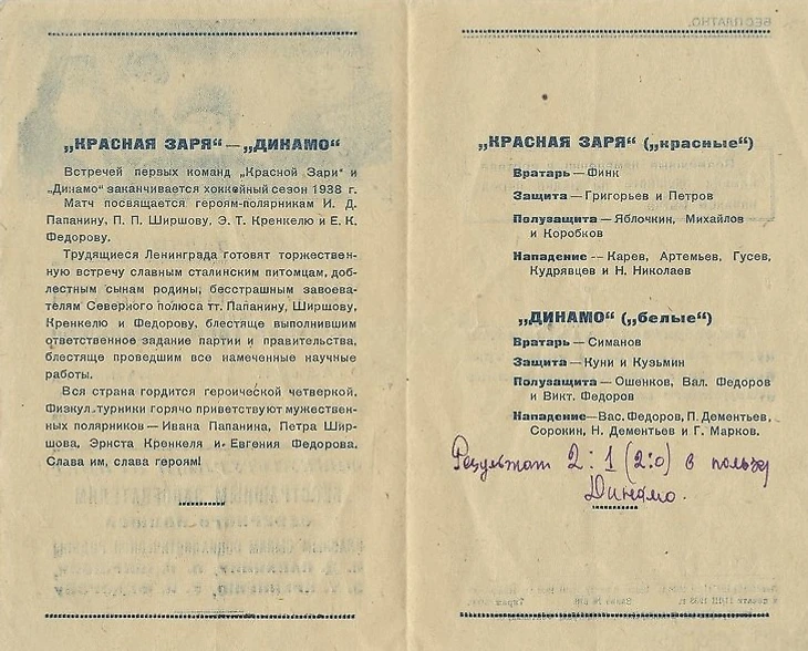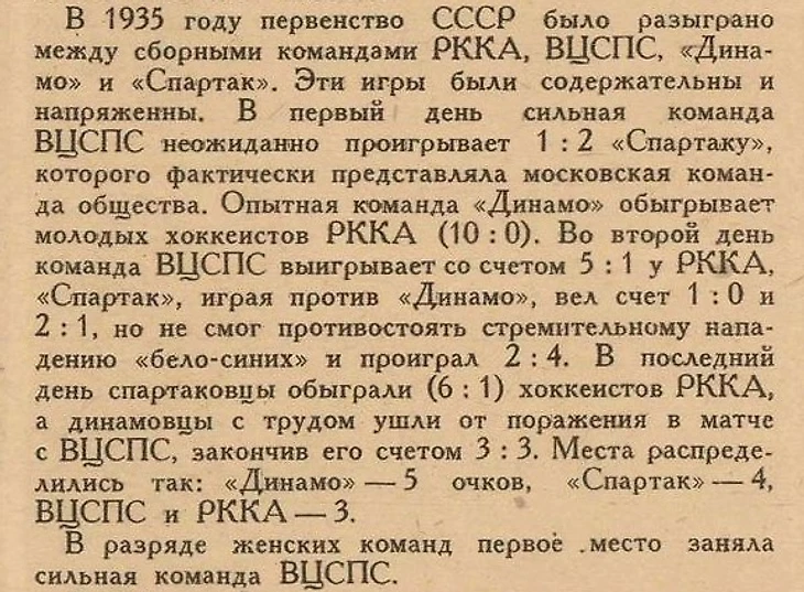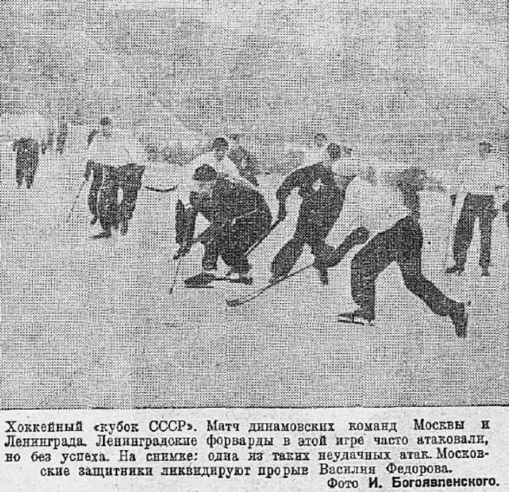 26 февраля 1936 года. «Динамо» (Ленинград) - «Динамо» (Москва) - 2:0 (0:0) «В течение 10 дней первенств любители хоккея ожидали центральной встречи двух динамовских коллективов. В обоих составах добрая половина игроков сборных команд столиц и СССР. Уже при выходе на лед обеих команд зрителя постигло первое разочарование: у ленинградцев нет Егорова и В. Федорова, Москва вышла без Квашнина.