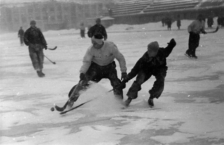 22 декабря 1946 года. Москва. Малый стадион «Динамо». Первенство СССР по канадскому хоккею. «Спартак» (Москва) - «Динамо» (Ленинград) - 6:1 (2:0, 1:0, 3:1). Фото Б. Борисова из газеты «Вечерняя Москва» № 298от 23 декабря 1946 года