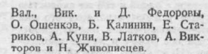 Состав: Климов; Сергеев и Ежов; Виктор (?) Федоров, Батырев и Надуваев; Аббакумов, Марков, Тимофеев, Сидельников и Паутов