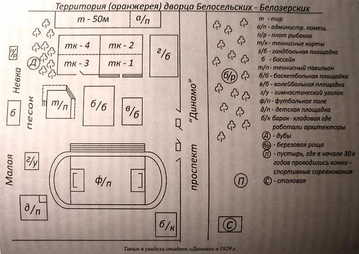 1929. Ленинград. Крестовский остров. Схема стадиона «Динамо». Вместо катка, который будет открыт 15 декабря 1930 года, еще пустырь - «П» (Н.Б. Ветошникова «Теннис в моей жизни», СПб, 2011 / citywalls.ru)