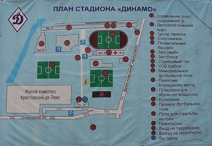 Конец 2010-х годов. Санкт-Петербург. Крестовский остров. Схема стадиона «Динамо». «№ 10» - поле открытое 2 июня 1929 года; «№ 14» - каток открытый 15 декабря 1930 года; «№ 2» - поле с трибунами (проект архитекторов О.Л. Лялина и Я.О. Свирского) открытое в 1934 году [22 мая 1936 года на нем прошел первый матч клубного чемпионата СССР по футболу между хозяевами и московским «Локомотивом»] / citywalls.ru