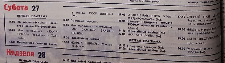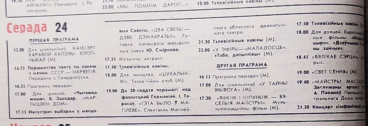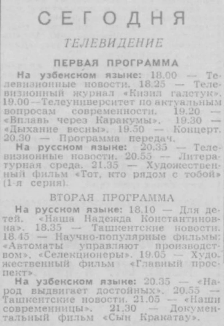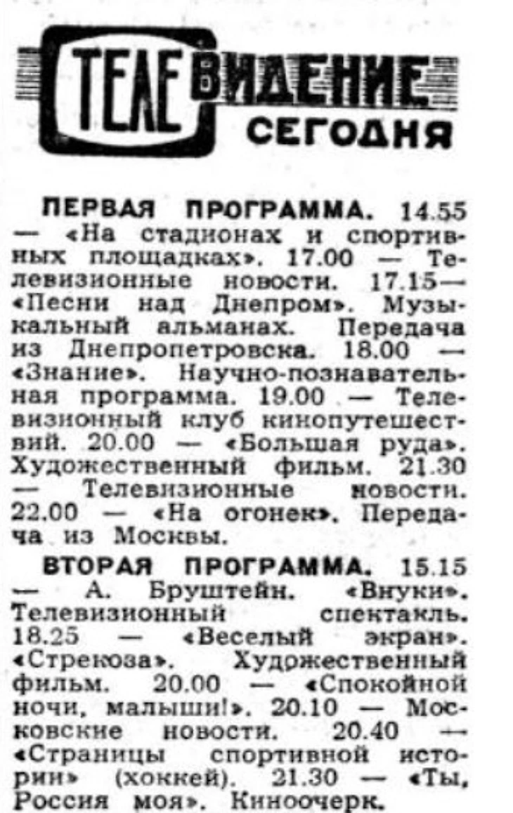 24 февраля 1965 года. Программа Ташкентского телевидения (газета «Правда Востока» № 55 от 24 февраля 1965 года). Но не на весь Советский Союз шла трансляция игр IV чемпионата мира по хоккею с мячом, как пример - Узбекская ССР
