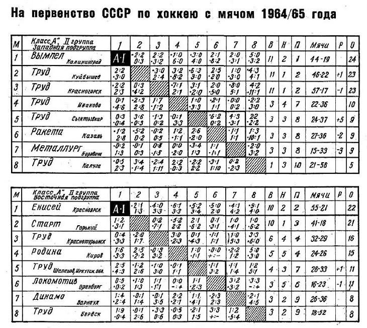 В заключение, для понимания роли городов, принимавших у себя игры IV чемпионата мира, в отечественном хоккее с мячом тех лет, приведу итоговые таблицы чемпионата СССР 1964/45 годов.
