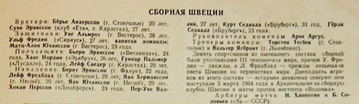 22 февраля 1965 года. Иваново. Стадион «Текстильщик». 14 000 зрителей. Швеция - Норвегия - 2:2 (1:1)