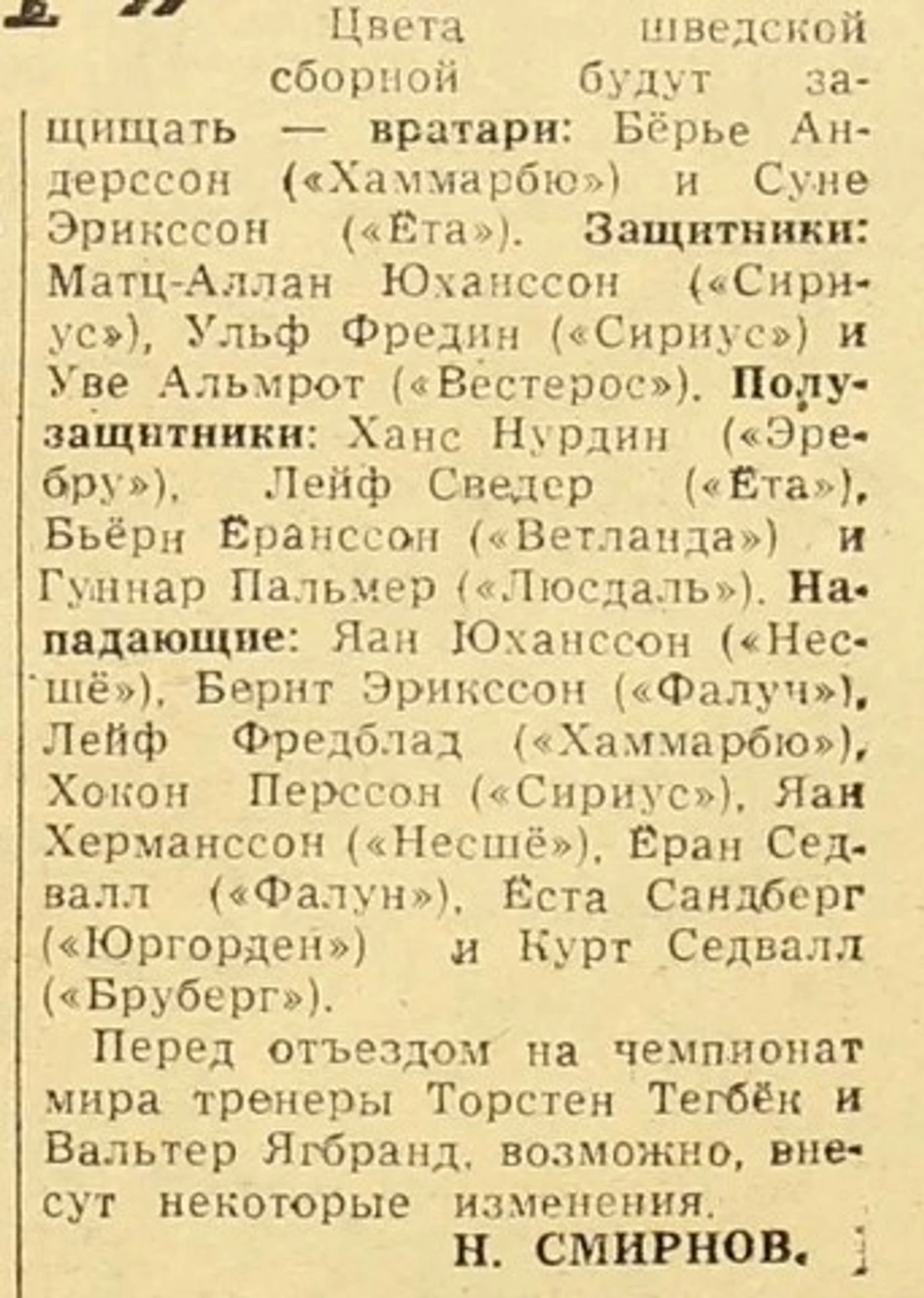 IV чемпионат мира по хоккею с мячом. Предварительный состав сборной Швеции из газеты «Советский спорт» № 33 за 13 февраля 1965 года