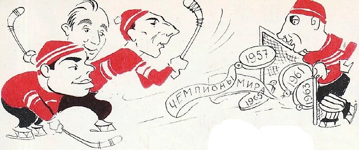 Сборная Советского Союза - четырехкратный чемпион мира по хоккею с мячом (дружеские шаржи Игоря Соколова из журнала «Спортивные игры» № 12 за декабрь 1965 года на Николая Дуракова, Валерия Маслова, Евгения Папугина и Анатолия Мельникова)