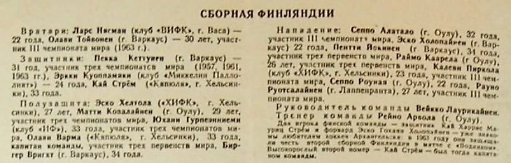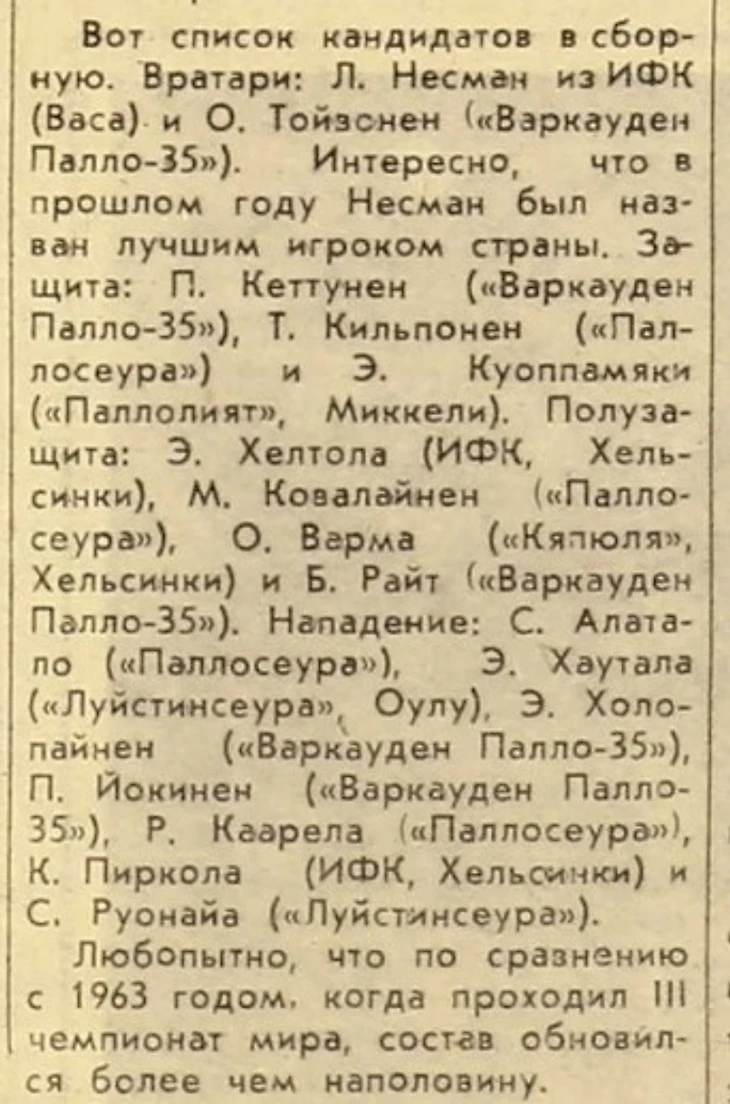 IV чемпионат мира по хоккею с мячом. Предварительный состав сборной Финляндии из газеты «Советский спорт» № 33 за 10 февраля 1965 года («Паллосеура» - «Оулун Паллосеура» / Oulun Palloseura или ОПС / ORS из Оулу; «Луйстинсеура» - «Оулун Луйстинсеура» /Oulun Luistinseura или ОЛС / OLS)