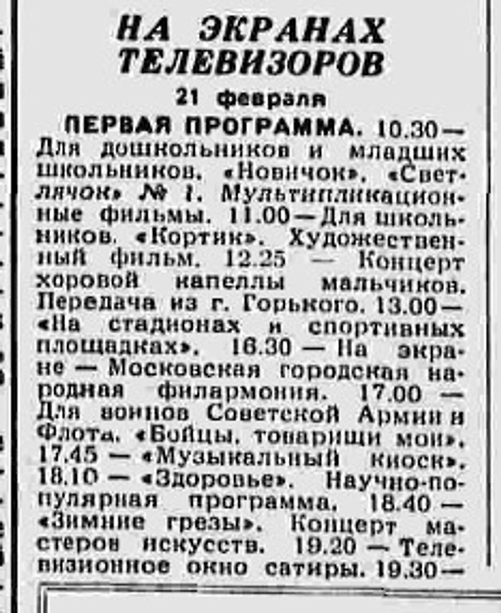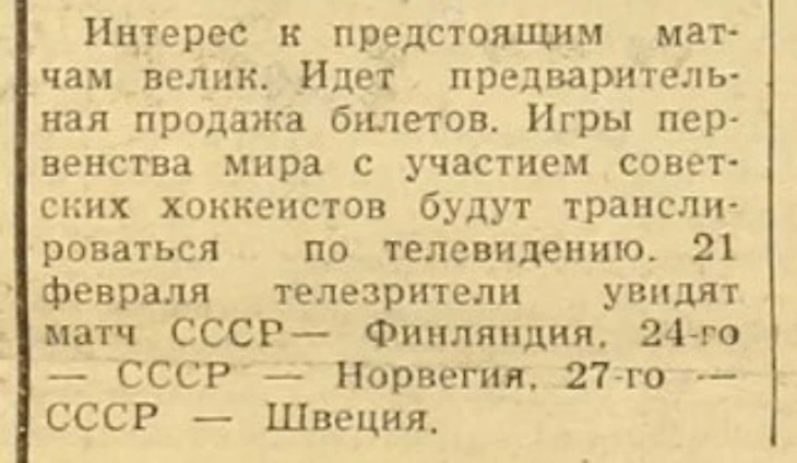 21 февраля 1965 года. Фрагмент программы телевизионных трансляций из газеты «Правда» № 52 от 21 февраля 1965 года. Репортаж со стадиона «Динамо» о матче советской и финской сборных обозначен под рубрикой «На стадионах и спортивных площадках»