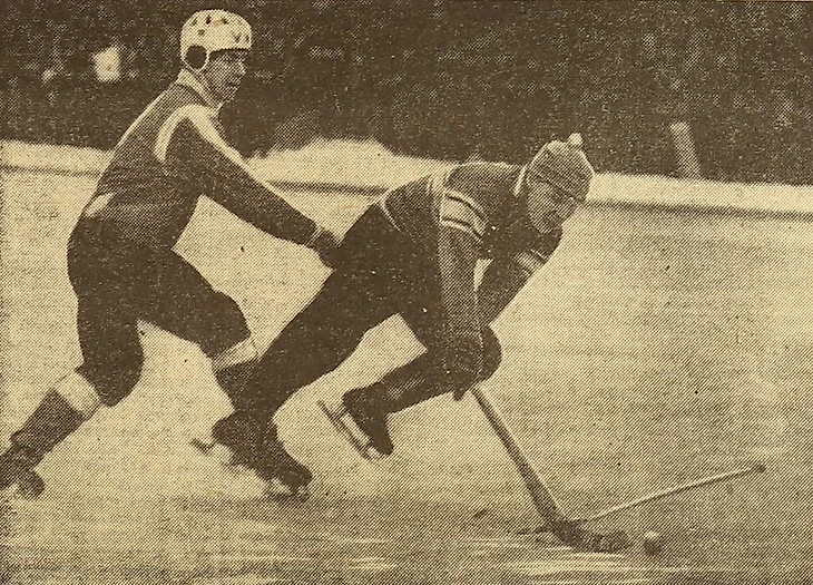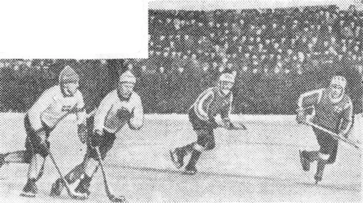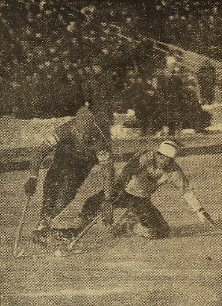 27 февраля 1965 года. Москва. Центральный стадион «Динамо». 15 000 зрителей. СССР - Швеция - 3:3 (1:1). «В матче хоккеистов СССР и Швеции хозяева поля наиболее активно действовали на правом фланге, где в оборонные порядки шведов постоянно врывались то Валерий Маслов, то Николай Дураков» В атаке В. Маслов. (фото Б. Светланова из газеты «Советский спорт» № 48 за 27 февраля 1965 года)