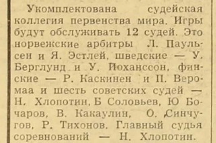 IV чемпионат мира по хоккею с мячом. Судейская коллегия (газета «Советский спорт» № 43 за 21 февраля 1965 года)