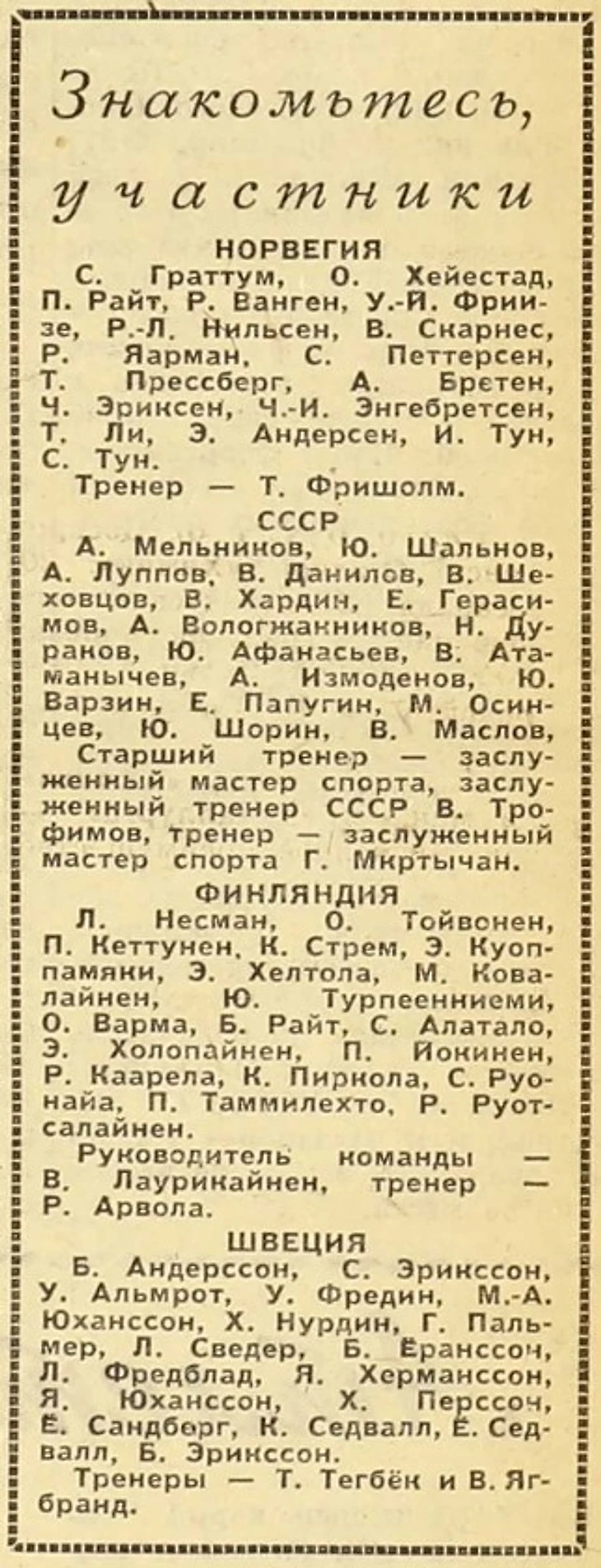IV чемпионат мира по хоккею с мячом. Состав сборных команд-участниц (газета «Советский спорт» № 43 за 21 февраля 1965 года)