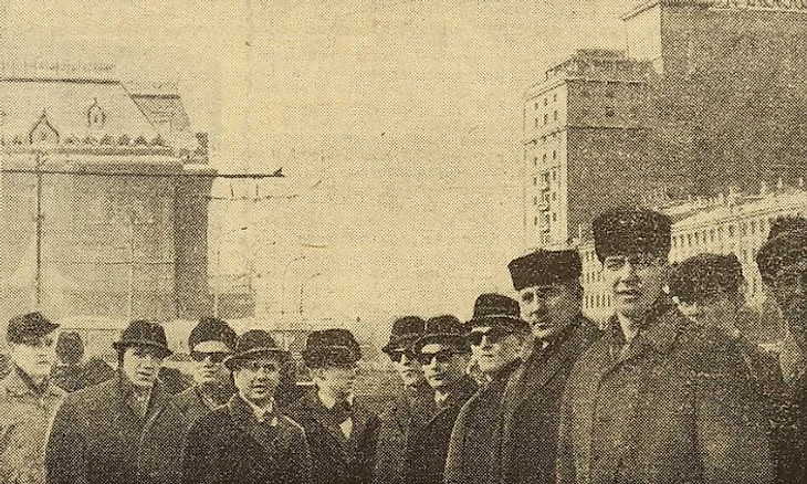 20 февраля 1965 года. Москва. «Первыми в Москву прибыли хоккеисты Финляндии. <...> Финские гости знакомятся с достопримечательностями столицы» (фото Ю. Моргулиса из газеты «Советский спорт» № 43 за 21 февраля 1965 года)