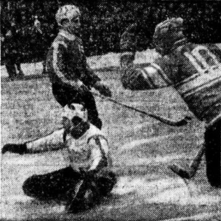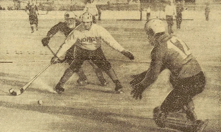 26 февраля 1965 года. Курск. Стадион «Трудовые резервы». 15 000 зрителей. Норвегия - Финляндия - 1:0 (1:0). «Одна из атак хоккеистов Финляндия (справа налево): норвежские игроки вратарь Эриксен, защитник Хейестад и финский нападающий Йокинен» (фото В. Шандрина из газеты «Советский спорт» № 48 за 27 февраля 1965 года)