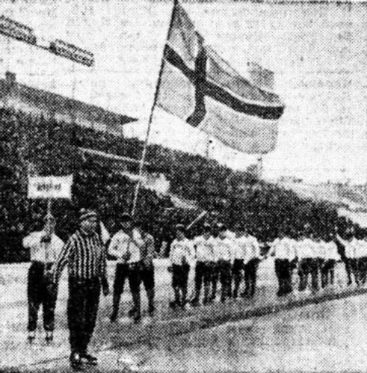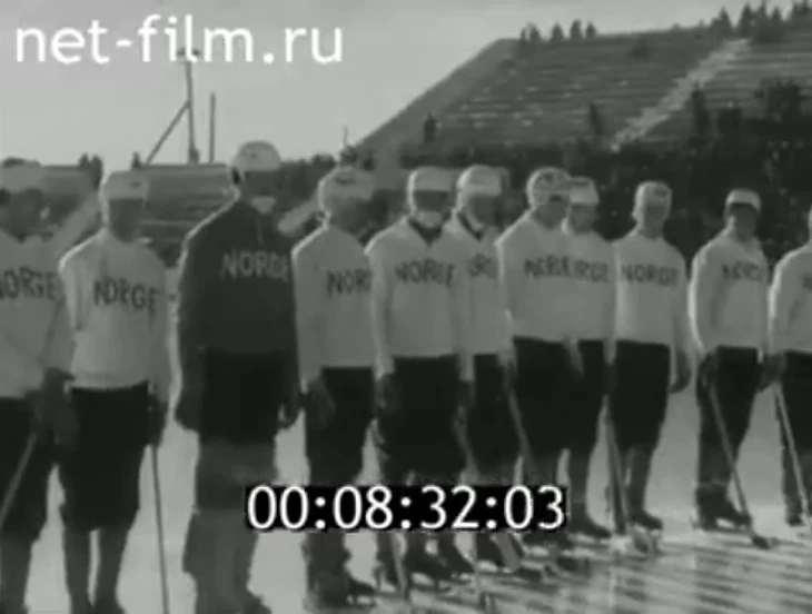 22 февраля 1965 года. Иваново. Стадион «Текстильщик». 14 000 зрителей. Швеция - Норвегия - 2:2 (1:1). Норвежцы перед игрой (стоп кадр из киножурнала «Наш край» № 14 за 1965 год)