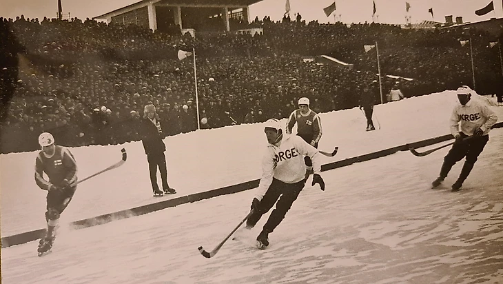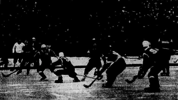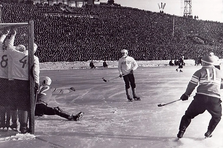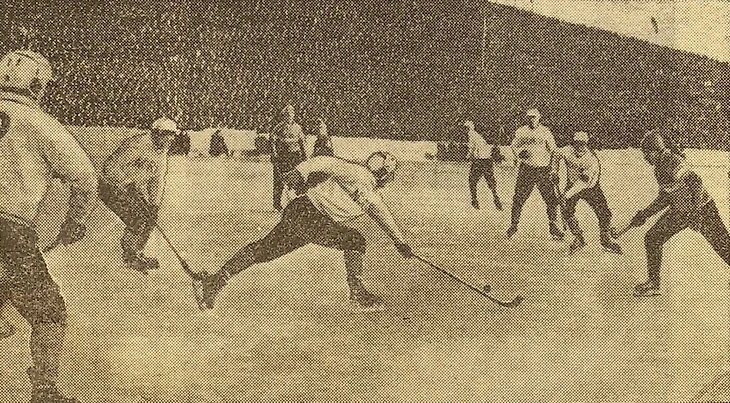 24 февраля 1965 года. Свердловск. Центральный стадион. 26 700 зрителей. СССР - Норвегия - 4:0 (2:0). «В матче против сборной СССР норвежские хоккеисты придерживались оборонительной тактики» (фото И. Пашкевича из газеты «Советский спорт» № 47 за 26 февраля 1965 года)
