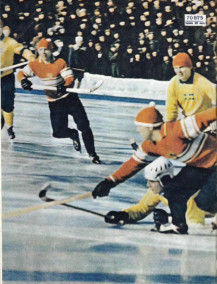27 февраля 1965 года. Москва. Центральный стадион «Динамо». 15 000 зрителей. СССР - Швеция - 3:3 (1:1). «Шведы к началу второго периода вели 3:1, и нашим ребятам пришлось приложить немало усилий, чтобы сквитать счет». (фото И. Осипова из журнала «Спортивные игры» № 4 за апрель 1965 года)