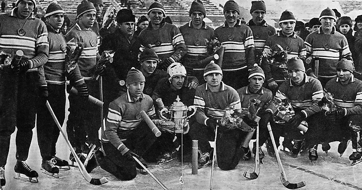 27 февраля 1965 года. Москва. Центральный стадион «Динамо». Сборная СССР - победитель IV чемпионата мира по хоккею с мячом (фото А. Бочинина из журнала «Огонек» № 10 за 7 марта 1965 года)