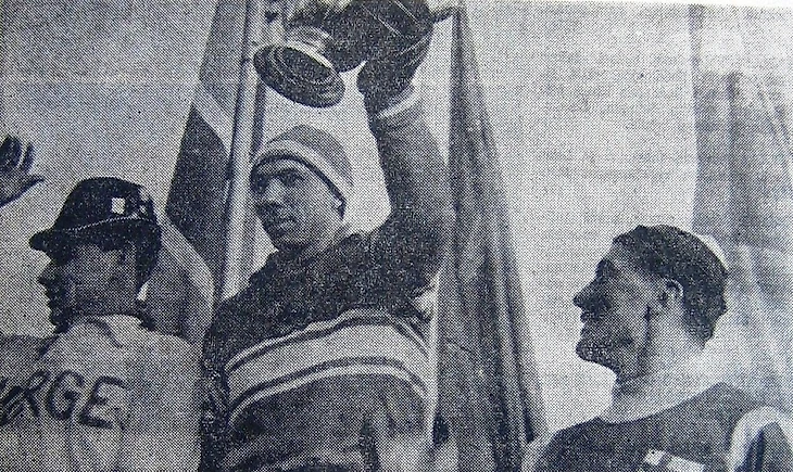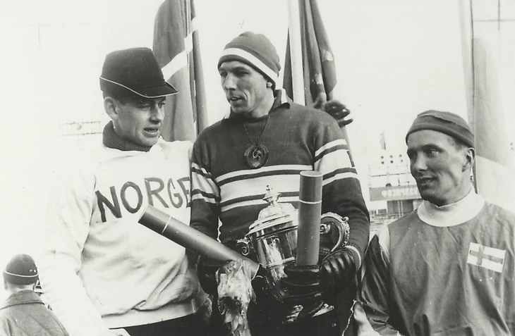 27 февраля 1965 года. Москва. Центральный стадион «Динамо». Капитаны команд Уле-Йонни Фриисе (Норвегия), Евгений Папугин (СССР) и Олави Варма (Финляндия) на пьедестале IV чемпионата мира по хоккею с мячом (Одно из положений розыгрыша IV чемпионата мира, как оказалось в самый последний момент, противоречило решению конгресса Международной федерации хоккея с мячом, принятому в 1963 году. При равенстве очков оргкомитет более высокое место отдавал тому, кто выигрывал личную встречу. А конгресс считал, что важнее разница забитых и пропущенных мячей. Организаторы вручили финнам, обыгравших шведов, бронзовые медали и нарвались на протест от от шведской федерации. Финны отказались вернуть полученные медали и Международной федерации пришлось изготовить второй комплект для шведов)
