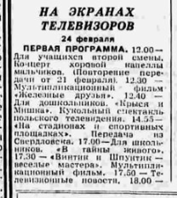 24 февраля 1965 года. Фрагмент программы телевизионных трансляций из газеты «Правда» № 55 от 24 февраля 1965 года. Репортаж из Свердловска снова в рубрике «На стадионах и спортивных площадках»