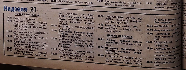 21 февраля 1965 года. «Показывает Минск. На голубых экранах республики» (tvp.netcollect.ru). А на «Белорусском телевидении и радио» - «Открытие чемпионата мира по хоккею с мячом. Матч СССР - Финляндия»