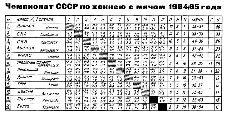 Итоговая таблица чемпионата СССР 1964/65 годов в I группе класса «А» (журнал «Спортивные игры» № 11 за ноябрь 1965 года)