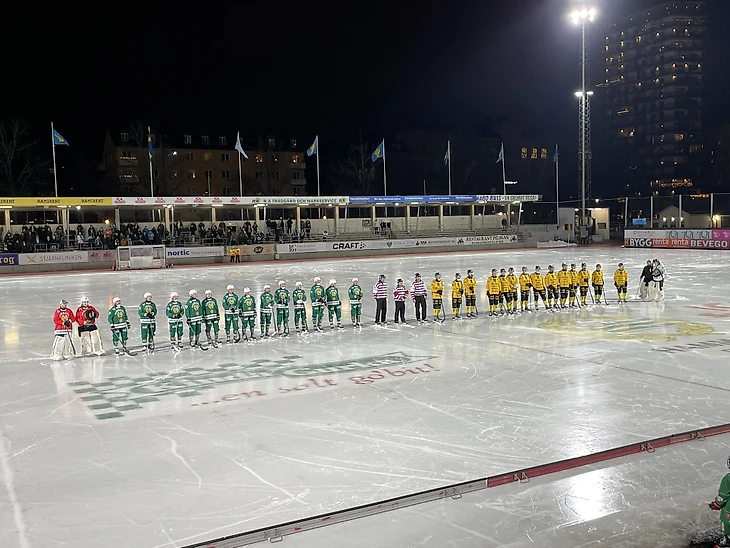 Спустя пару минут на льду появляются и гости в жёлтых свитерах - «Оби/Тьюреда». Для новичка Элитсерии этот матч уже ничего не решает, и им предстоит сыграть за выживание с клубами, занявшими 2-3 место в Алльсвенскан. А вот «Хаммарбю» очень нужна победа в этом матче, а помимо этого ещё и поражение «Болльнеса» дома от «Виллы» - тогда столичный клуб вышел бы в четвертьфинал плей-офф напрямую с 6-го места.