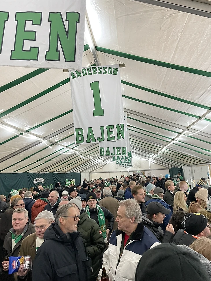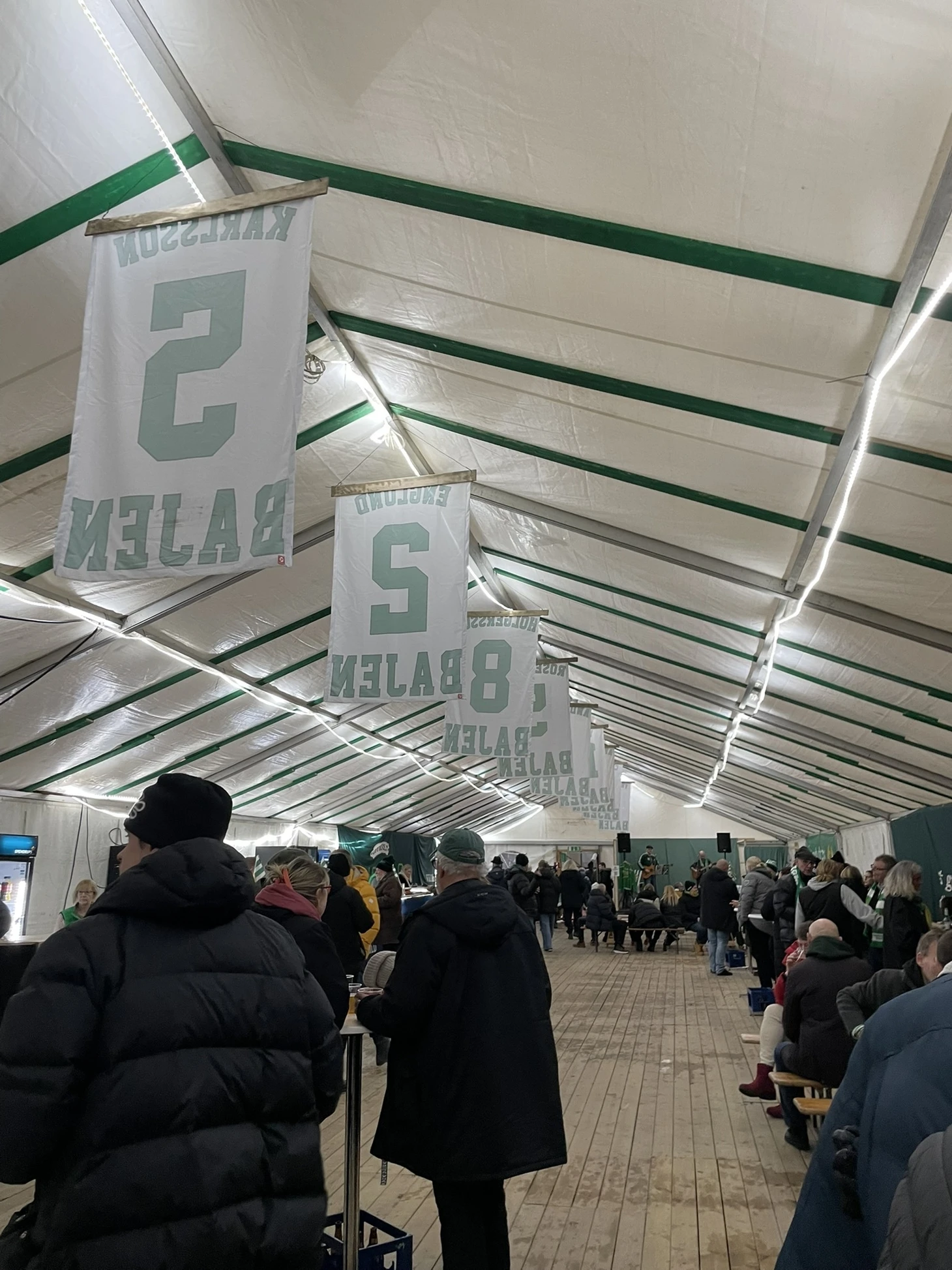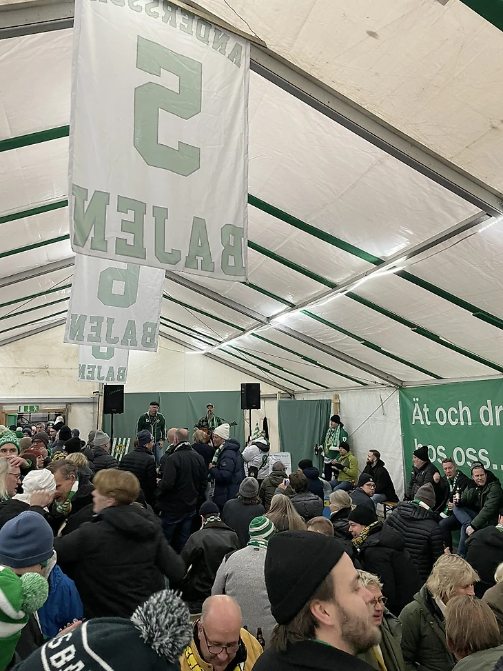 В перерыве я вернулся в шатёр за ещё одним пивом, и на этот раз он выглядел совсем иначе: внутри было не протолкнуться, к барной стойке выстроились четыре длиннющие очереди. Но рассасывались они достаточно быстро, а вот посидеть уже было нельзя. Наверное, весь стадион тут собрался - а на матче присутствовало чуть более 1100 зрителей, так что ничего удивительного. Весь перерыв людей развлекали живой музыкой и розыгрышами разных призов, а также лотереей 50/50 - очень важная статья доходов для клубов Элитсерии, кстати, и очень популярная вещь - весь первый тайм по трибуне ходили дети с большим QR-кодом, который вёл на сайт лотереи. Один лотерейный билет стоит 20 крон (177 рублей), но я его, разумеется, приобрести не мог - для этого нужен был шведский банк.
