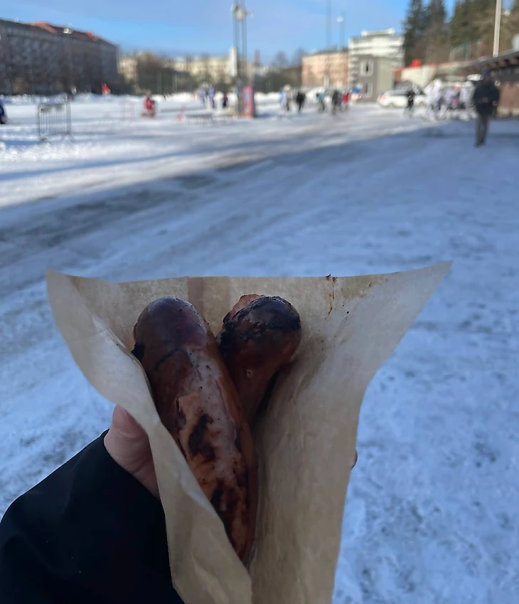 Перерыв в матче Бандилиги – моя самая любимая часть. В Финляндии бенди – не только спорт, но и способ провести время на свежем воздухе. А как ещё проводить время на свежем воздухе, если не с грилем? Поэтому недалеко от поля появляется небольшая палатка, в которой для всех желающих сотрудники клуба жарят большие финские сосиски – makkarat, на наши деньги – сардельки. Стоит это совсем недорого – 2 евро за штуку. Подается без хлеба и чего-либо ещё, просто сосиски в бумажном конверте.